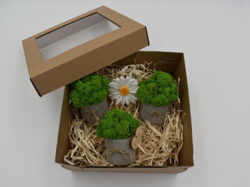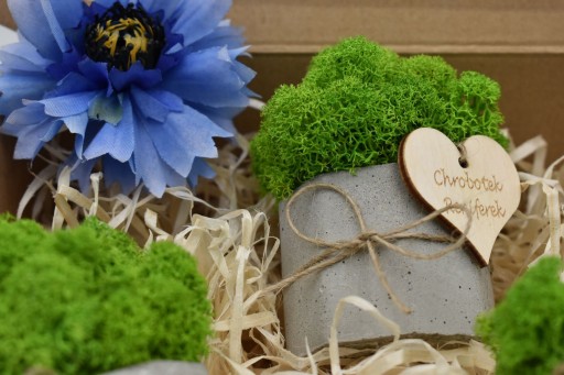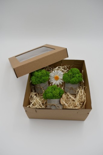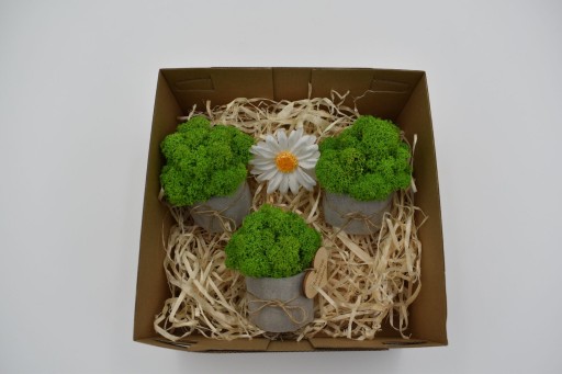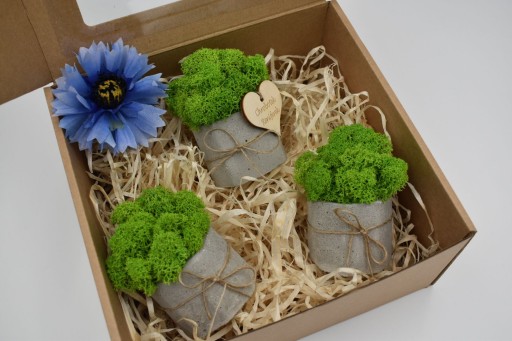 Wymiary ( 5cm x 5cm x 5cm wymiary doniczki bez mchu ok 5-6cm mech) z najwyższej jakości zielonego do wyboru: wiosenna zieleń ( jednokolorowego), gęstego i naturalnie impregnowanego fińskiego mchu chrobotek reniferowy. Doniczka wykonana ręcznie z betonu architektonicznego.