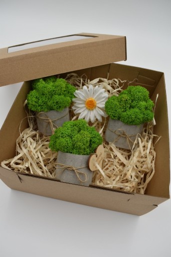 - w środku: mini Chrobotkowy las w szarej betonowej ręcznie wykonanej doniczce z jasnozielonym fińskim mchem Chrobotekiem Reniferowym 3 sztuki