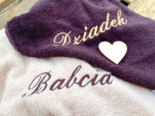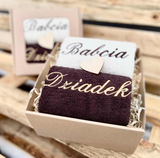 - komplet 2 grubych, miłych w dotyku ręczników do rąk: ecru/beż z brązowym napisem Babcia i brązowy ręcznik z ecru napisem Dziadek, rozmiar 50x30 cm,