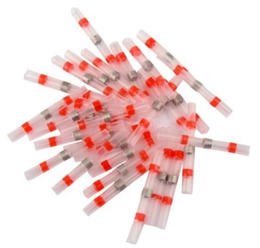 Przezroczysta rurka termokurczliwa z pierścieniem cyny na środku oraz dwoma pierścieniami kleju termicznego po bokach, który dodatkowo uszczelnia połączenie.