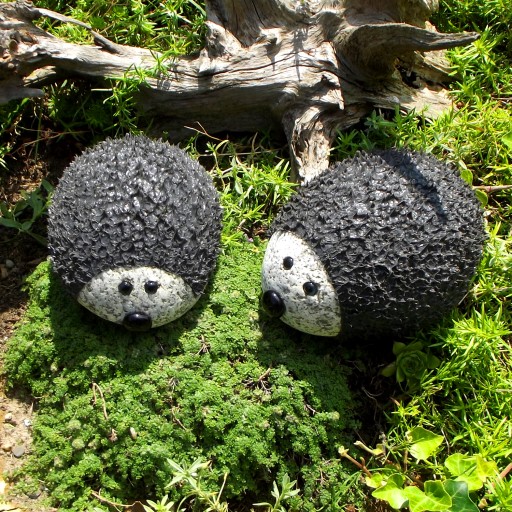 Jeż wykonany z naturalnego kamienia granitu, oczy i nosek są szklane, kolce silikonowe miękkie i elastyczne w kolorze grafitowym. Jeżyki są całkowicie odporne na warunki atmosferyczne, mogą zimować w ogrodzie. Każdy jest inny, niepowtarzalny. Wielkość to 13 cm do 15 cm, waga około 2 do 3 kg.