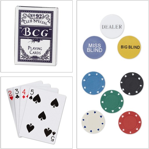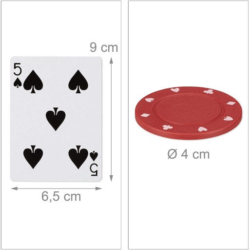 2 talie kart, 200 żetonów, Dealer button, Small Blind, Big blind i mata do gry w pokera to wszystko czego potrzebujesz by poczuć się jak w prawdziwym kasynie.