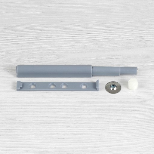 Opis działania: Odbojnik pracuje na zasadzie docisku drzwiczek do mebla, co spowoduje zamknięcie. Ponowny docisk drzwiczek sprawi, że się otworzą. Do drzwiczek przykręcamy metalowy pierścień, dzięki czemu głowica odbojnika, która jest zaopatrzona w magnes, sprawi, że drzwiczki się nie otworzą samoczynnie.