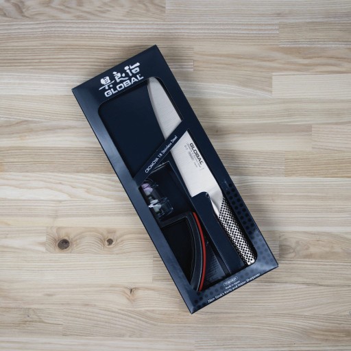 Dwuczęściowy zestaw, w którym znajduje się bestsellerowy, wszechstronny Nóż szefa kuchni G-2 oraz poręczna ceramiczna ostrzałka wodna MinoSharp, zaprojektowana specjalnie z myślą o utrzymaniu noży Global w perfekcyjnym stanie. Tak funkcjonalny komplet to niewątpliwie rozsądny pierwszy krok w tworzeniu kuchennej kolekcji noży, a ponieważ jest zapakowany w estetyczne pudełko, znakomicie posłuży jako prezent dla każdego miłośnika sztuki kulinarnej.