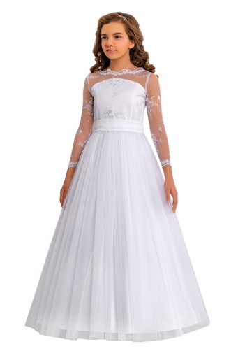 Mamy do zaoferowania śliczną sukienkę komunijną w kolorze białym. Posiada ona tiulowy dół oraz górę wykonaną z koronki ozdobioną cekinami. W środku znajduje się wszyta halka dzięki czemu sukienka pięknie się układa. Z tyłu sukienka zapinana jest na zamek, a talia wykończona jest delikatnym satynowym paskiem.
