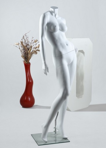 Elegancki manekin damski wykonany z gipsu idealnie odwzorowujący szczegóły i detale kobiecej sylwetki wzmocniony włóknem szklanym nadającym trwałość i odporność podczas eksploatowania.