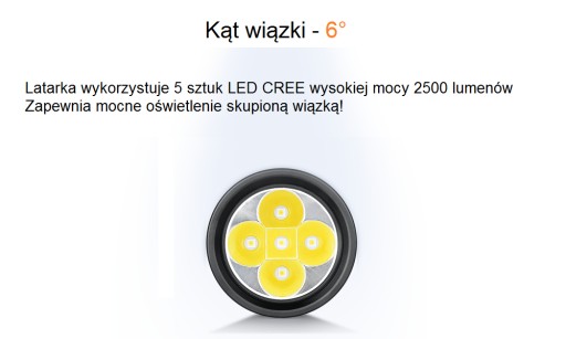 Wysokiej jakości światło, dzięki pięciu diodom LED i dedykowanej optycznej konstrukcji dającej 6° wiązkę punktową.