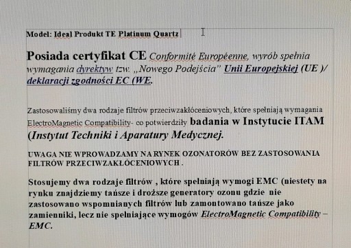 - firma zapewnia dożywotnie, prawidłowe działanie generatora ozonu/ozonatora, przy pogwarancyjnych, corocznych przeglądach odpłatnych/ czyszczenie, test