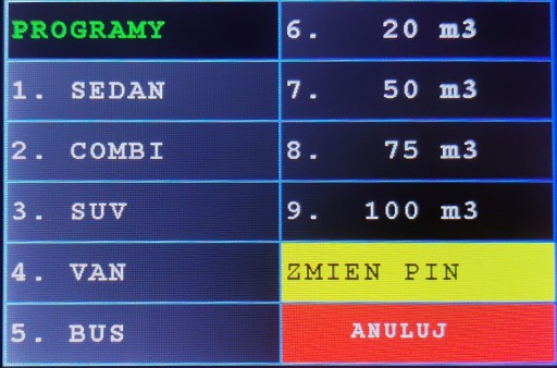 - automatyczne programy do ozonowania samochodów: SEDAN, COMBI, SUV, VAN, BUS