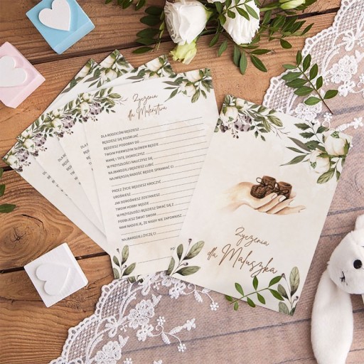 - świetna zabawa na Baby Shower - karty rozdane wszystkim uczestniczkom przyjęcia będą fantastyczną grą imprezową, a do tego stanowić będą swego rodzaju księgę gości z przyjęcia Baby Shower i zbiór przepięknych życzeń dla dziecka :-)