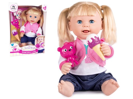 Interaktywna lalka Amelka ubrana w śliczny komplecik: bluzkę z kamizelką i dżinsowe spodenki. Lalka posiada długie blond włosy które idealnie nadają się do czesania. Amelka uwielbia jeść zimne smakołyki, wystarczy podać jej loda który został dołączony do zestawu. Po naciśnięciu na brzuszek lalka wydaje zabawne odgłosy.
