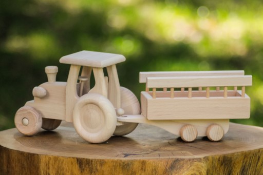 Traktor z przyczepką w naturalnej barwie drewna - niemalowany.
