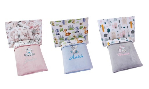 Dwustronny kocyk + dwustronna poduszka– kocyk o rozmiarze 75×100 cm wykonany jest z pluszu Minky oraz tkaniny bawełnianej z dodatkowym ociepleniem. Na kocyku haftujemy dowolną grafikę oraz imię dziecka. Poduszka płaska z wypełnieniem o rozmiarze 30x40cm wypełniona antyalergiczną kulką silikonową. Kocyk jest bezpieczny dla dziecka, wykonana z najwyższej jakości surowców, zgodnych z wymogami UE.