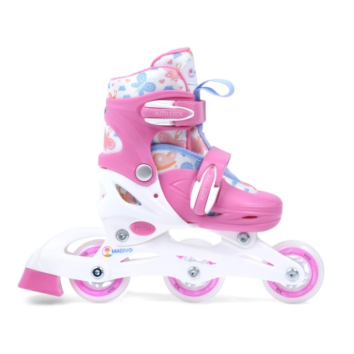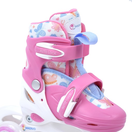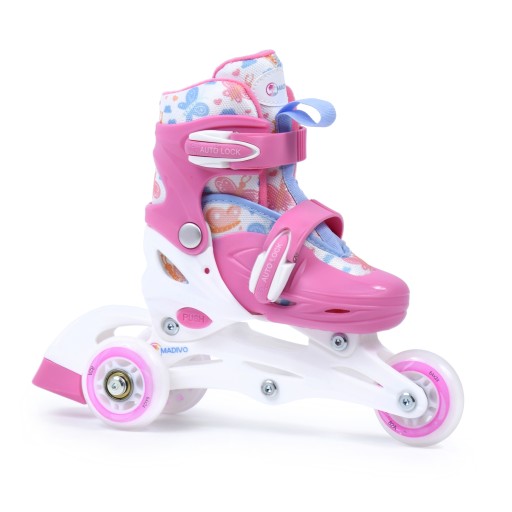 Regulowane Rolki / Wrotki (2w1) MADIVO COTTONCANDY to wysokiej jakości sprzęt stworzony z myślą o najmłodszych użytkownikach którzy właśnie rozpoczynają przygodę ze skatingiem. Charakteryzują się solidną konstrukcją, która zapewnia stabilność i komfort podczas jazdy. Dzięki możliwości regulacji rozmiaru, rolki te są bardzo wszechstronne i mogą rosnąć razem z użytkownikiem, co czyni je doskonałym wyborem dla dzieci.