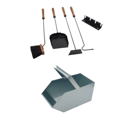 Zestaw niezbędny przy każdym kominku i piecu. Węglarka z blachy ocynkowanej + szufelka do węgla z drewnianym trzonkiem + pogrzebacz wyposażony w drewnianą rękojeść + wygarniacz z drewnianą rączką.