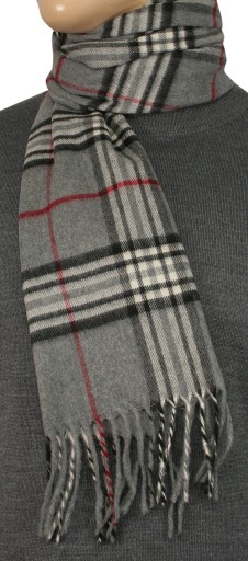 Szalik Szary z Frędzlami, w Kratkę Burberry, Firmy V.Fraas -Cashmink- Jesienno-Zimowy, Męski