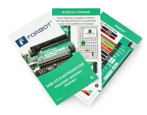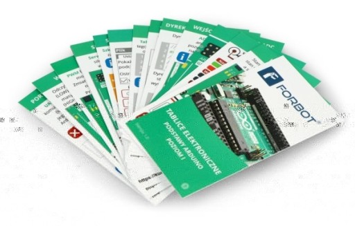 Zestaw 15 podręcznych tablic, na których znajdują się praktyczne informacje dotyczące ekosystemu Arduino oraz budowy i programowania tego minikomputera. Obustronnie zadrukowane karty stanowią zbiór najważniejszych informacji z kursu podstawy Arduino przygotowanego przez portal FORBOT. Dzięki niewielkim rozmiarom tablice można mieć zawsze przy sobie. Dla większej trwałości zabezpieczono je folią.