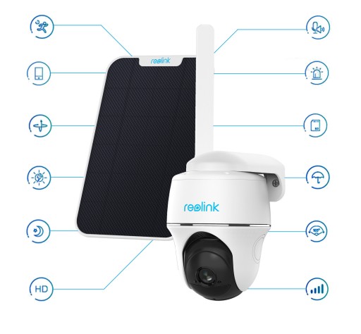 Kamera bezprzewodowa Reolink GO PT to obrotowy model kamery FullHD z panelem solarnym, akumulatorem, wbudowanym mikrofonem dwukierunkowym z możliwością nagrywania na kartę microSD 64GB (16GB w zestawie).