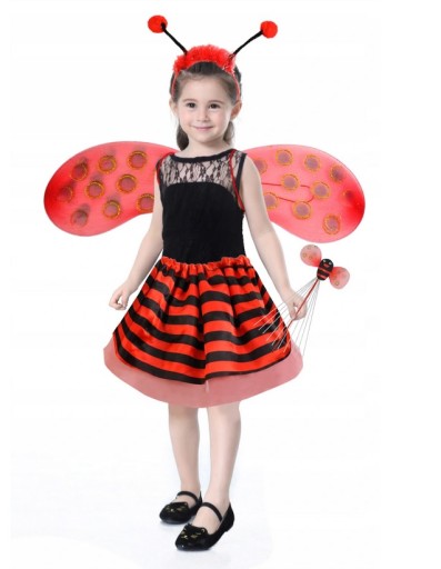 4-częściowy komplet umożliwia praktyczne wykorzystanie. Strój jest atrakcyjny wizualnie, odznacza się ciekawym wyglądem i estetycznym wykończeniem elementów. Krótka, rozkloszowana, spódniczka na gumce jest rozciągliwa i idealnie dopasowuje się do ciała. Miękki materiał wpływa na wygodę, a czarno-czerowne paski dodają atrakcyjności. Skrzydełka z brokatową, złotą aplikacją wykonano z lekkiego, półprzezroczystego materiału. Gumeczki gwarantują szybkie i łatwe zakładanie. Opaska posiada pluszowe czułki na sprężynkach oraz piórkowe dodatki, a różdżka zakończona jest dekoracyjnymi tasiemkami oraz uroczą biedronką.