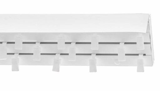 Standardowe upięcie stosowane do szyn pcv. Po wewnętrznej stronie żabki znajdują się ząbki, które zapobiegają wyślizgiwaniu się firan/zasłon.