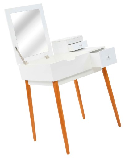 Meble w stylu skandynawskim są niezwykle popularne w wielu domowych przestrzeniach. Ich prosty styl i forma sprawiają, że aranżacje stają się jasne i przejrzyste. Sprzyjają odpoczynkowi od codziennego zgiełku i mnogości kolorów. Dodatkowo wnętrza z nich stworzone niezmienne zachwycają swoim designem. Nasza toaletka Vivienne 4X świetnie sprawdzi się jako element Twojej wymarzonej sypialni. Ten niezwykle kobiecy mebel pomieści wszystkie Twoje kosmetyki. Urocze szufladki mogą być idealnym miejscem na Twoją biżuterię. Natomiast chowane lustro to dodatkowy atut. Dlaczego? Nie osiada na nim kurz, ponieważ gdy go nie potrzebujesz po prostu zamykasz blat. Toaletka zamieni się wtedy w praktyczne biurko. Idealna oszczędność przestrzeni, prawda? Dzięki kompaktowym wymiarom toaletka Vivienne 4X świetnie sprawdzi się nawet w małej sypialni. Zobacz Siebie jak zasiadasz do niej rano zbierając się do pracy a potem zamykasz ten blat i nawet jeśli zrobiłaś trochę bałaganu spiesząc się nie będzie tego widać.