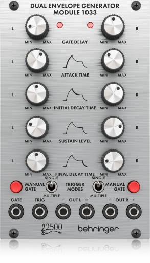Behringer seria 2500 DUAL ENVELOPE GENERATOR MODULE 1033 to autentyczna reprodukcja oryginalnego układu “systemu 2500” z lat 70-tych, który miesci się w standardowej obudowie eurorack. Moduł 1033 umożliwia tworzenie głęboko przetworzonego sygnału z 10 gałkami do niezależnej kontroli nad opóźnieniem bramki, czasu ataku, czasu initial Decay, susteinu, i final Decay. Twórz jazgotliwe i perkusyjne dźwięki lub długo ewoluujące przebiegi, idealne do funkowego groove lub ponurej ścieżki dźwiękowej do najnowszego cyberpunkowego stylu.