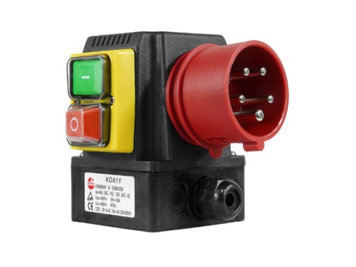 Wyłącznik elektromagnetyczny trójfazowy z wtyczką nadbudowaną 16A, 5 bolcy, stosowany w silnikach elektrycznych. Wyłącznik posiada wbudowalny przekaźnik który wyłącza silnik w przypadku braku prądu oraz zabezpiecza przed samoczynnym załączeniem silnika.