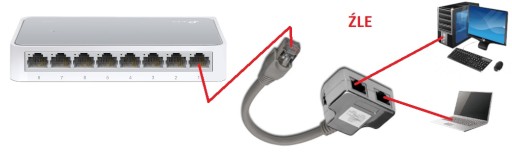 Należy pamiętać, że przy stosowaniu tego typu rozdzielacza uzyskamy maksymalnie przepustowość 100 Mbps, a wszystkie kable połączeniowe użyte z rozdzielaczem powininy być kablami prostymi - bez przeplotu.