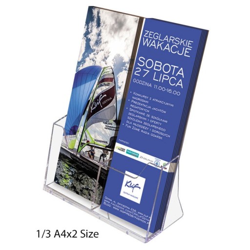Wysokiej jakości stojak na ulotki A4 oraz DL odlewany ze szkła akrylowego "PMMA plexiglass" dzięki czemu stojak jest praktycznie przezroczysty. Stojaki idealnie nadają się do eksponowania Twoich ulotek oraz katalogów.