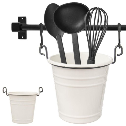 Pojemnik na przybory kuchenne do zawieszenia. Wykonany z metalu w kolorze białym. Wysokość pojemnika wynosi 12,5 cm a średnica 13,5 cm. Może służyć również jako osłonka na kwiatki lub zioła. W zestawie mocowanie za pomocą którego możemy pojemnik zawiesić na relingu. Relingi, które umożliwiają zawieszenie pojemnika dostępne są w naszej ofercie. Pojemnika nie należy myć w zmywarce do naczyń. Pojemnik nie zawiera przyborów kuchennych widocznych na zdjęciu. Oryginalny produkt czeskiej marki Orion. Wyprodukowano zgodnie z europejskimi standardami.