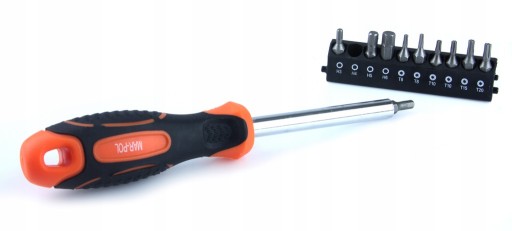 Zestaw śrubokrętów i bitów MAR-POL sprawdzi się w każdym garażu czy warsztacie. Dołączony w zestawie stojak ułatwia przechowywanie śrubokrętów. Z tyłu stojaka znajdują się 2 otwory montażowe umożliwiające powieszenie całego zestawu na ścianie.
