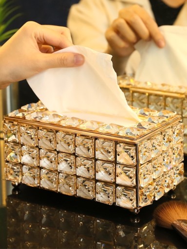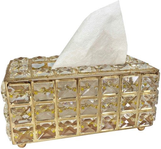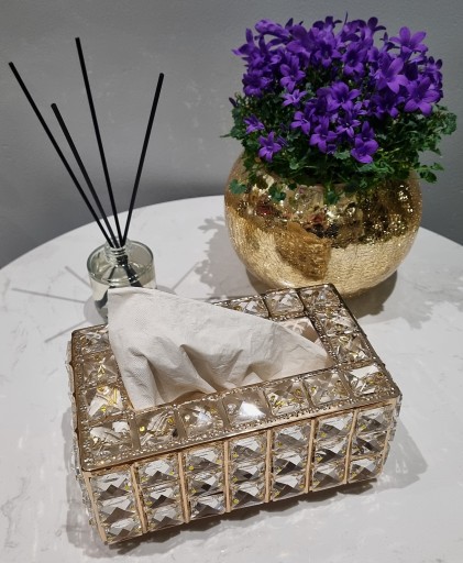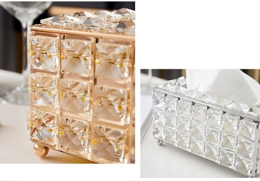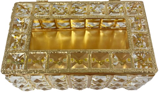 Pudełko na chusteczki z kryształami po bokach, a także górnej postawie. Dno pojemnika jest metalowe, zakończone czterema podnóżkami okrągłymi. Otwór jest w kształcie prostokąta.