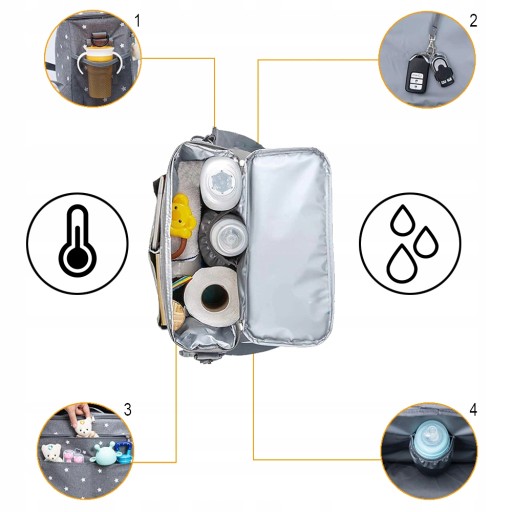 W poszczególnych komorach z przegródkami możesz poukładać rzeczy tak, aby wszystko było na wyciągnięcie ręki, np. ubranka, pieluchy, butelki, jedzenie, zabawki. Największa kieszeń torby zamykana jest na podwójny zamek błyskawiczny, co ułatwia wyciąganie z niej rzeczy.