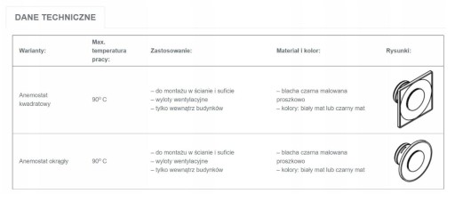 Anemostat posiada w komplecie ramkę montażową wykonaną jest z blachy ocynkowanej.