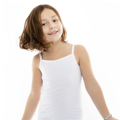 Dziewczęca podkoszulka na wąskich ramiączkach, która jest bardzo wygodna. Koszulka jest gładka, co daje jej bardzo estetyczny wygląd i sprawia, że pasuje pod każdą część garderoby.