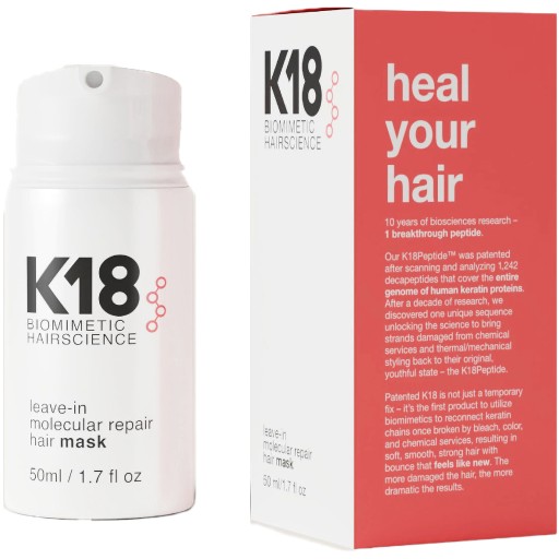 K18 Hair to całkowicie nowa kategoria produktów do włosów wykorzystująca pielęgnację biomimetyczną, która odwraca zniszczenia spowodowane przez rozjaśnianie, farbowanie, stylizację cieplną, a jednocześnie odbudowuje pojedyncze włókna włosów na poziomie molekularnym.