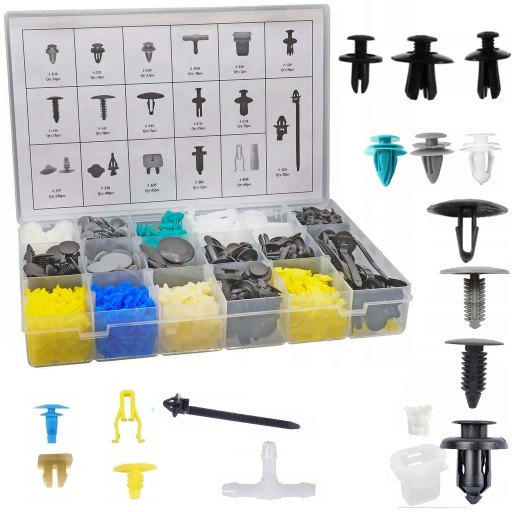 Uniwersalny zestaw 17 rodzajów spinek, klipsów, kołków, zatrzasków samochodowych do mocowania tapicerki w samochodzie, błotników, zderzaków, drzwi. W zestawie znajdują się standardowe rozmiary stosowane w większości samochodów osobowych i dostawczych takich jak: