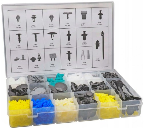 Uniwersalny zestaw 17 rodzajów spinek, klipsów, kołków, zatrzasków samochodowych do mocowania tapicerki w samochodzie, błotników, zderzaków, drzwi. W zestawie znajdują się standardowe rozmiary stosowane w większości samochodów osobowych i dostawczych takich jak: