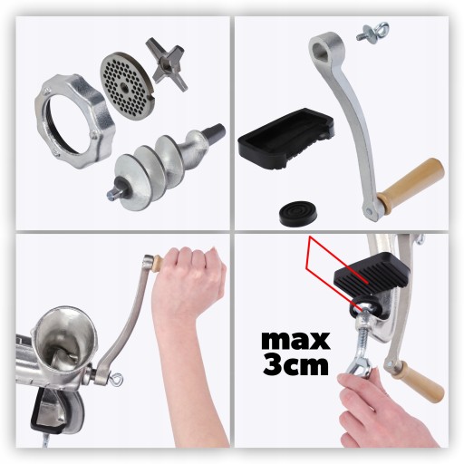 Drewniana rękojeść nie tylko pięknie się prezentuje, ale przede wszystkim jest wygodna w użytkowaniu, dbając o delikatną skórę naszych dłoni. Gumowe nakładki sprawnie zabezpieczą blat, dlatego nie musisz martwić się o uszkodzenie stołu. Natomiast stopki sprawią, że montaż maszynki do blatu stołu będzie szybki i komfortowy.