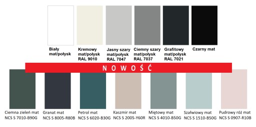- Pozostałe kolory wg palety RAL i NCS za 5 % dopłatą.
