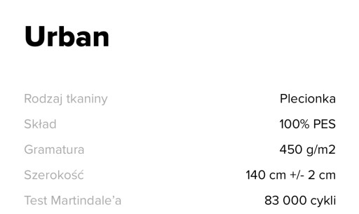Tkaniny z kolekcji Urban to piękne plecionki, które nadają niezwykłego ciepła każdemu wnętrzu. Tkanina jest mocna, bardzo wytrzymała (ponad 80 000 cykli ścieralności), ale zarazem miękka i przyjemna w dotyku, dzięki czemu można określić ją jako wzór wśród materiałów obiciowych. Bardzo dobrze układa się na meblach, którym nadaje miękkości i puszystości. Ponadto tkaninę można prać!