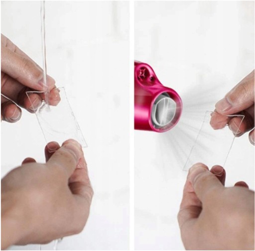 - Taśmę można używać wielokrotnie. Przyklej a gdy już nie będzie potrzebna odklej ją spłucz czystą wodą wysusz aby odzyskała swoja lepkość i użyj ponownie. Jest wyjątkowo elastyczna, można ją przycinać do dowolnej długości.