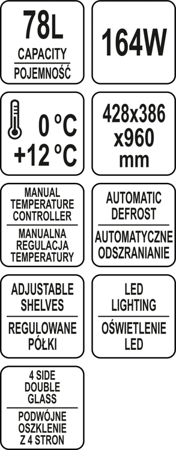 Witryna chłodnicza YATO ma pojemność 78L i posiada trzy wzmacniane i powlekane ochronnym PVC półki o regulowanej wysokości mocowania. Dostęp do nich odbywa się za pośrednictwem otwieranych drzwiczek szklanych. Wykonane są one z dwuwarstwowych szyb hartowanych, podobnie jak szyba frontowa i boczne. Zapewnia to dużą wytrzymałość, a jednocześnie bardzo dobre właściwości izolujące.