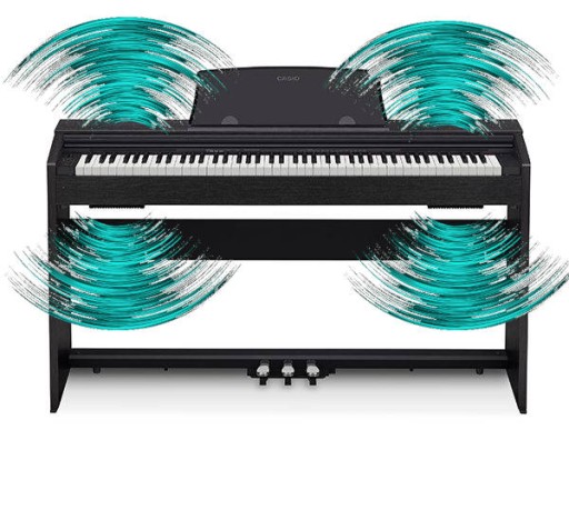 Dźwięk jest promieniowany nad klawiaturą oraz pod pianinem jak w akustycznym pianinie co stwarza wrażenie gry na akustycznym instrumencie.