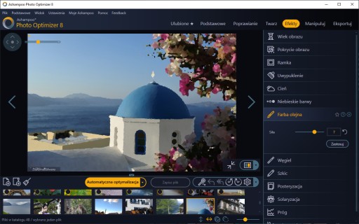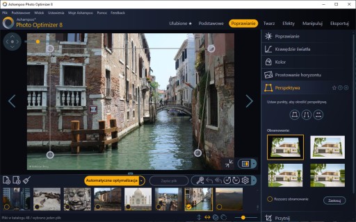 Ashampoo Photo Optimizer 8 poprawia zdjęcia jednym kliknięciem przycisku! Program w pełni zautomatyzowany sposób dopasowuje kolory, przejścia i ustawienia ekspozycji, aby dać Ci pełnię perfekcji w opanowaniu pojedynczych obrazów, jak i całych kolekcji. Wizualne niedoskonałości są wykrywane natychmiast i poprawiane z głęboką analizą obrazu. Możesz także dokonać tych zmian ręcznie: poszerzyć horyzont, naprawić perspektywę i zastosować wiele licznych efektów. Drobne problemy jak efekt czerwonych oczu, czy niedoskonałości skóry także są łatwo usuwane. Prosty interfejs użytkownika oszczędzi Ci czas i nerwy kierując wprost do zdumiewających rezultatów!