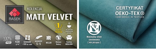 Tkanina MATT VELVET - Mięsisty i gruby welur o wysokiej gramaturze 430 g/m2. Matt Velvet to jeden z nielicznych matowych i nie cieniujących welurów (tkanina minimalnie cieniuje czyli w wysokim stopniu ogranicza zostawianie smug po przeciągnięciu ręką po powierzchni), posiada również wysoką odporność na mechacenie.. Matowe kolory oraz puszystość tkaniny sprawia, że materiał ma szerokie zastosowanie, sprawdzi się w wielu aranżacjach. Posiada również wysoką wytrzymałość na wycieranie oraz właściwości utrudniające wchłanianie płynów. Z powierzchni Matt Velvet łatwo wyczyścić różne zabrudzenia w tym również długopis czy rozlane wino.