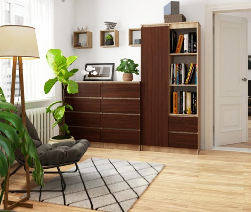 Regał na książki to podstawowy element wyposażenia domowej biblioteki. Przez dekady jego forma ewoluowała: od klasycznych modeli, w stronę świeżych, pomysłowych rozwiązań. Nowe propozycje projektantów zapewniają funkcjonalność użytkowania, oferując przy tym solidne i dobrze zaprojektowane meble. Tak też właśnie jest z regałem Benedik 3X, który dzięki swoim siedmiu pojemnym półkom pomieści zarówno książki, dokumenty, segregatory jak również zabawki Twojego malucha lub młodzieżową kolekcję komiksów Marvela. Dodatkową zaletą regału Benedik 3X są dwie szuflady zamontowane na metalowych prowadnicach rolkowych z blokadą wysuwu, które przechowają każdą ilość drobiazgów lub rachunków, które musisz mieć pod ręką, żeby nie przeoczyć terminu opłaty. Zamontowane drzwiczki, które skrywają za sobą cztery półki zapewniają dyskrecję w przechowywaniu prywatnych "skarbów", które w razie potrzeby są zawsze dostępne. Prezentowany regał wspaniale sprawdzi się w salonie, sypialni, gabinecie, a nawet pokoju dziecięcym. Odpowiednio eksponując przechowywane w nim rzeczy, nadaje dodatkowo wnętrzu niepowtarzalnego charakteru.