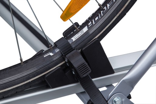 Uchwyt rowerowy Amos Tour, został wyposażony w twarde plastikowe podkładki pod koła roweru. Dodatkowo zostały użyte paski do ich spinania.