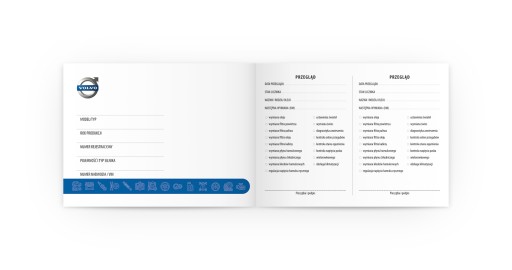 Książka serwisowa dedykowana samochodom marki VOLVO. Zawiera wszystkie potrzebne rubryki, tj.: informacje o pojeździe, przeglądach i przebytych naprawach, a także miejsce na dodatkowe notatki. Zestaw obejmuje także po dwa egzemplarze umowy kupna i sprzedaży auta, oraz oświadczenie o zdarzeniu drogowym.