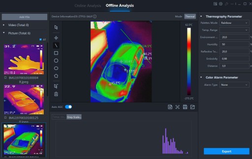 - Cztery palety kolorów (żelazo, tęcza, biały, czarny)